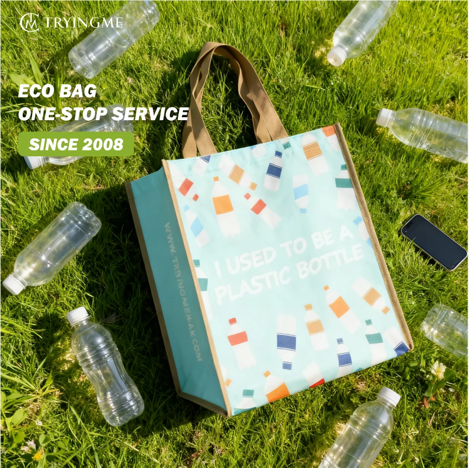 2026 New Medium Multifunction Waterproof Laminated RPET Reusable Shopping Folding Bag Shoulder Length Handle Custom
