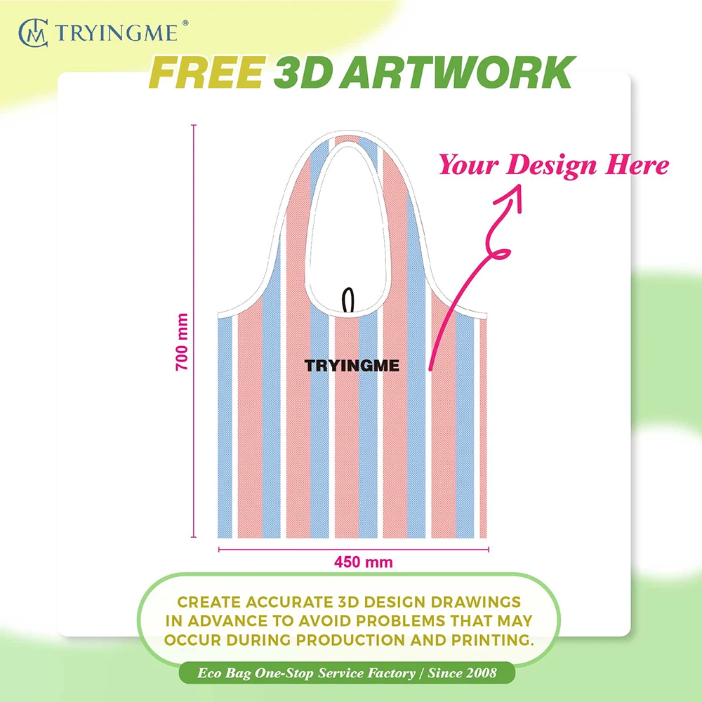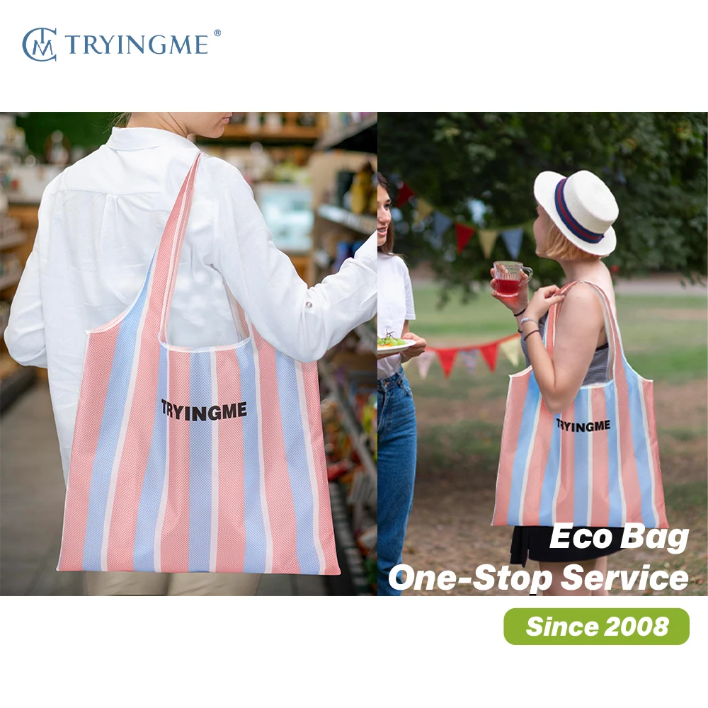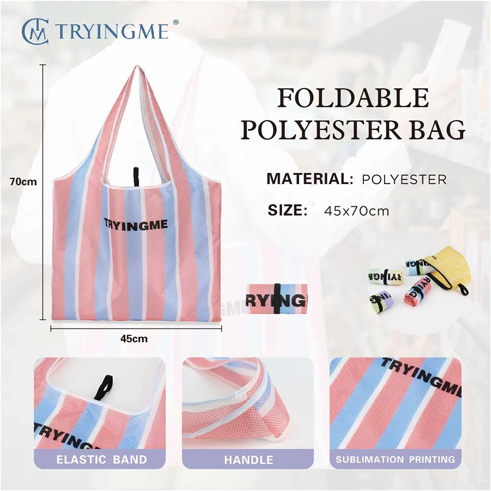 Customizable Expandable Folding Tote Bag Long Handle Ripstop Reusable Polyester Shopping Bag with Striped Pattern
